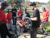 On Friday April 3rd, The Twilight After School Prorgam launched a Bike Club at Martin Luther King Jr. middle school in Marin City, with the help of Trips for Kids Instructor Jelani Bertoni. An enthusiastic group of kids from Bayside, Willow Creek and MLK has decided that they want go on gike rides as an after school activity, and with the help of dedicated mentor Wayne Price, and the Trips for Kids staff, they are getting up and rolling. The first Trips for kids class consisted of a lesson on the ABC’s of bike safety, some hands on repair work, and a quick check up of the bikes they will be riding. With more training and assistance, this after school group promisses to be a solid program and benefit to the community. Find out more at http://www.tripsforkids.org/.